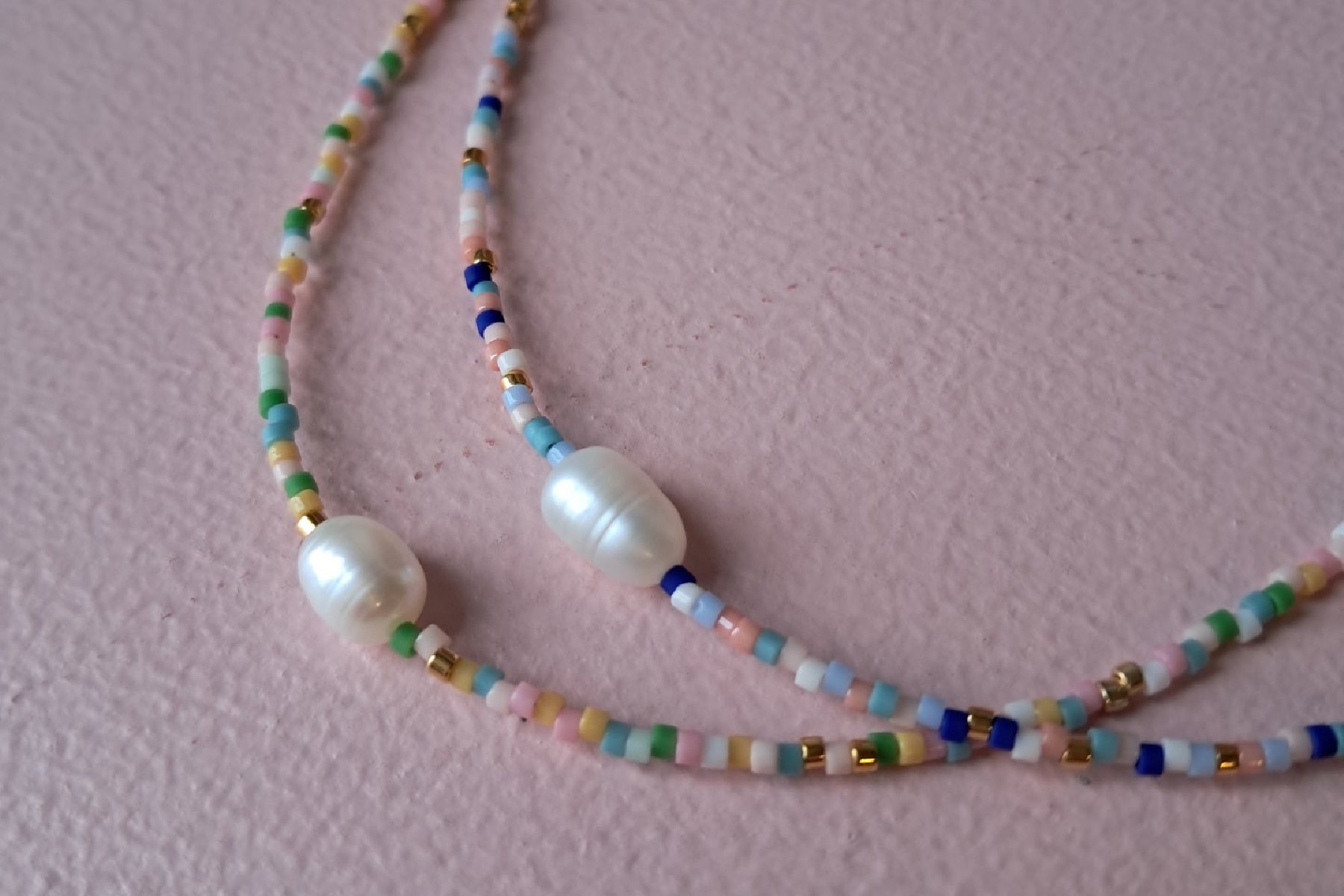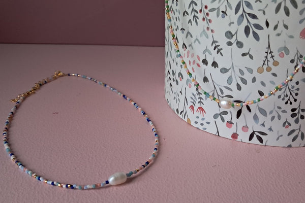 Smuk, kort feminin halskæde i en blanding af små farverige glasperler og en hvid ferskvandsperle i midten.