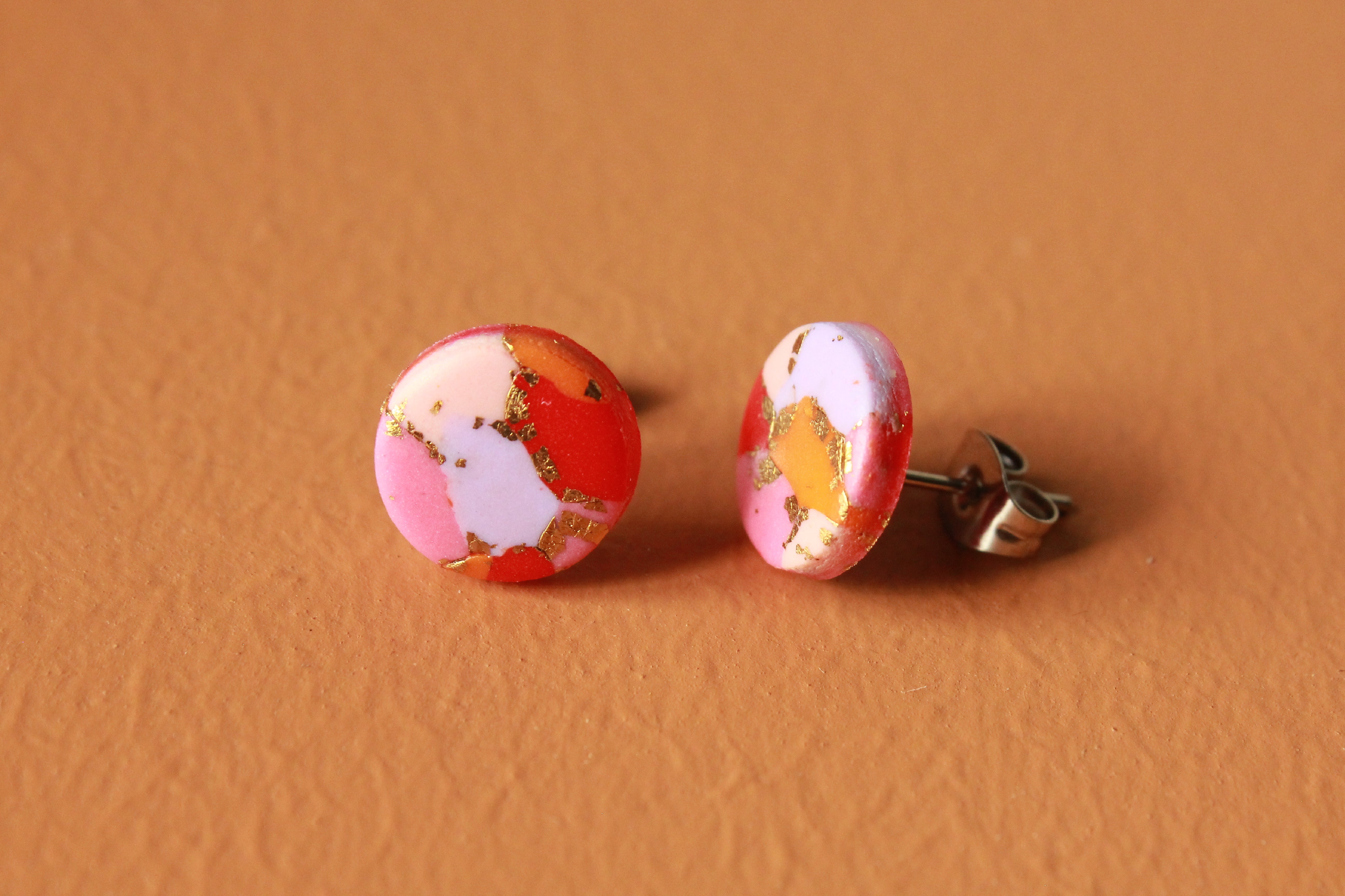 Lavet i farverne rød, pink, bubblegum, orange og lyselilla - kombineret med guldmetal. Øreringen er lakeret.